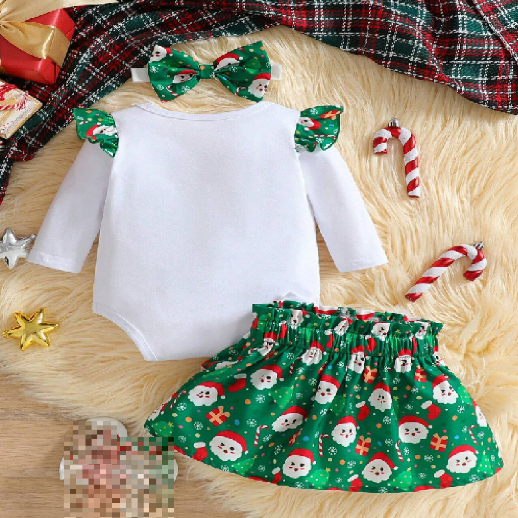 This festive 3-piece outfit includes a soft, long-sleeve romper printed with “My 1st Christmas”, a green Santa-print skirt featuring a large white bow, and a matching headband. Perfect for Christmas photos, parties, or cozy family gatherings.